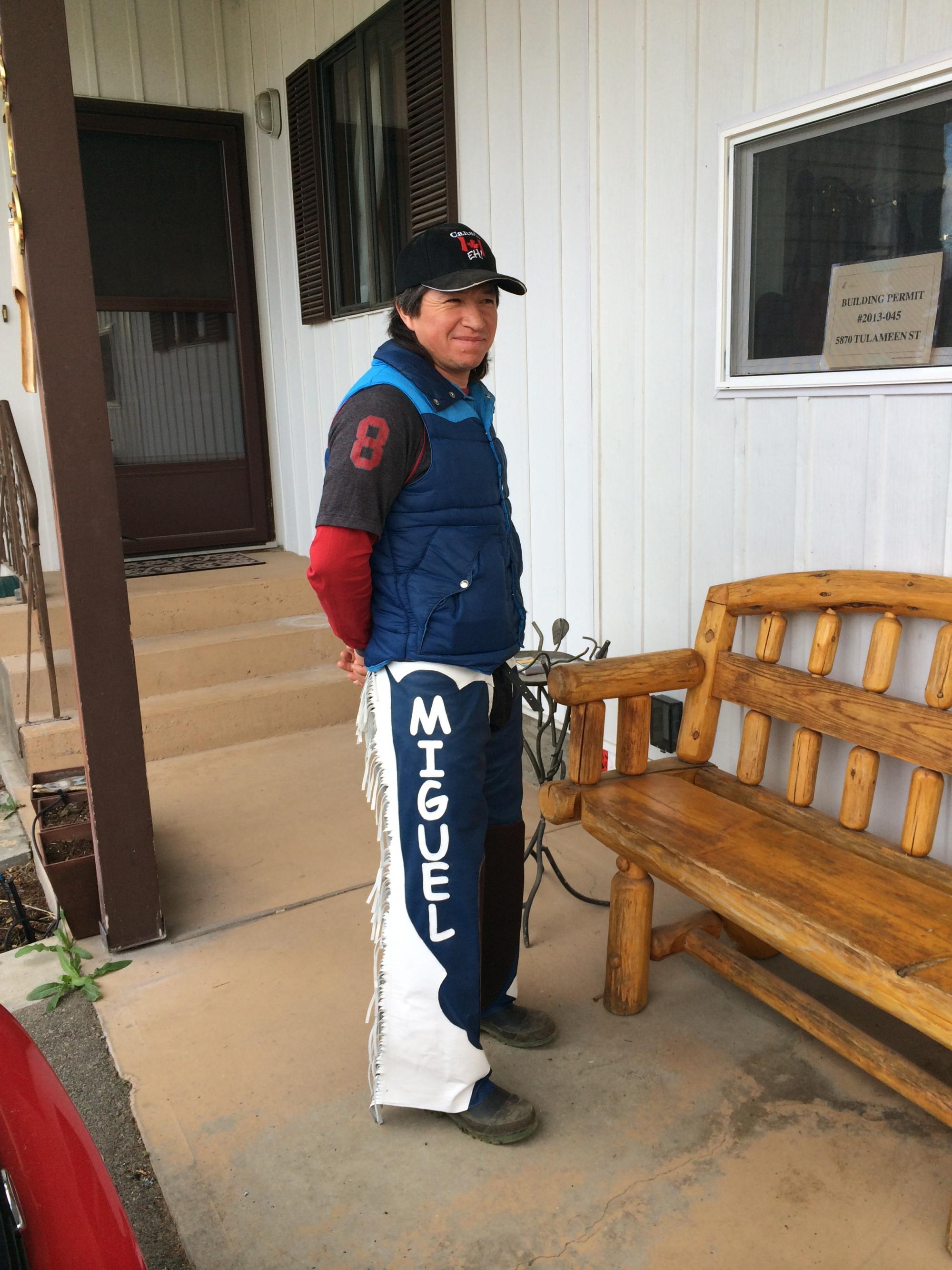 Riding Chaps, Electric Blue and White with 3" fringes and chink patches on inner knee and calf for Miguel a horse trainer who was working in Osoyoos, British Columbia, Canada.