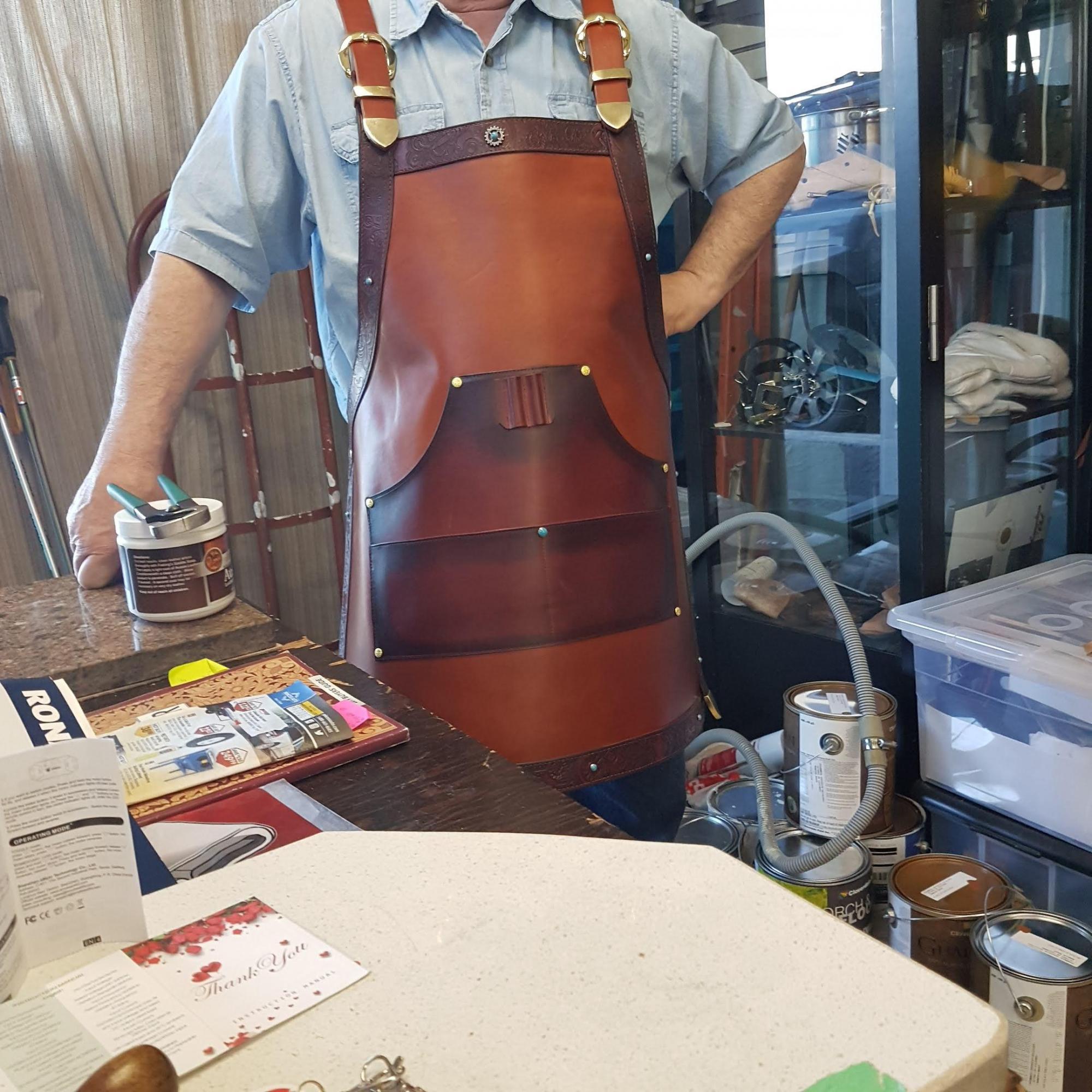 Aprons Assorted, Full Grain Leather, Hand tooled, Hand made in the Okanagan, Oliver, B.C., Canada.