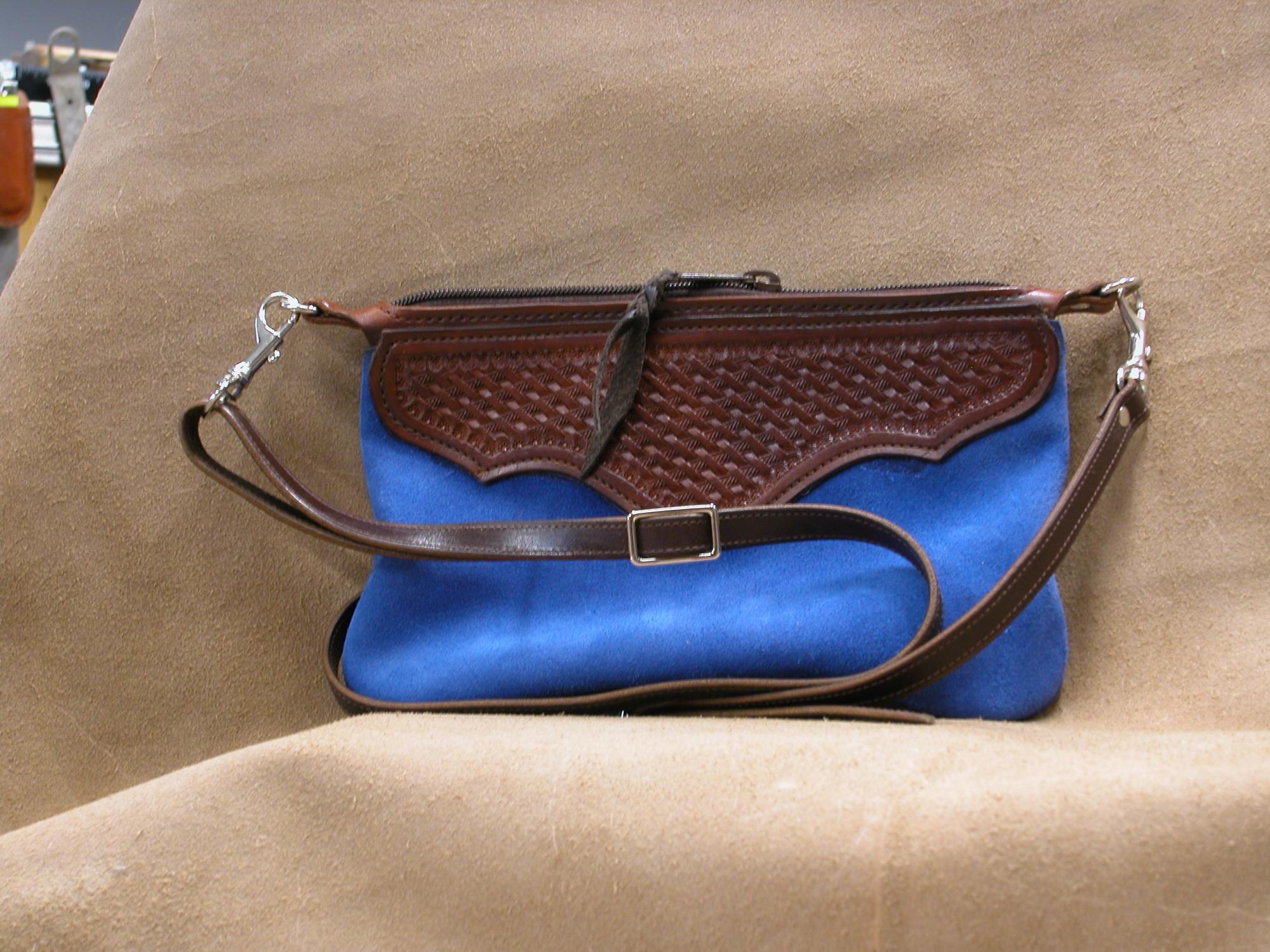 Purse Blue with tooled accents width 10" height 6 1/2", extra inside pocket 8"x 4", with adjustable shoulder strap